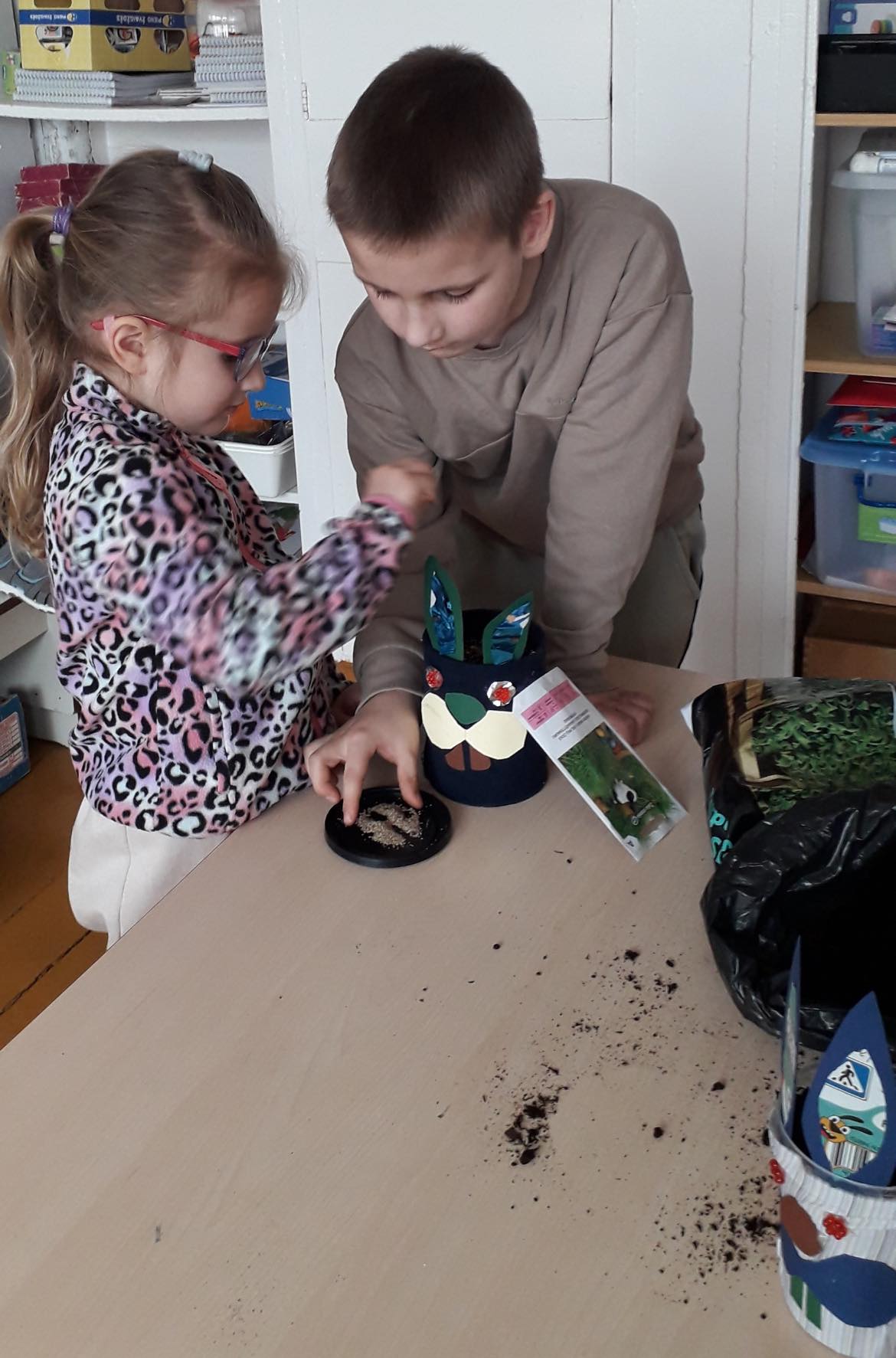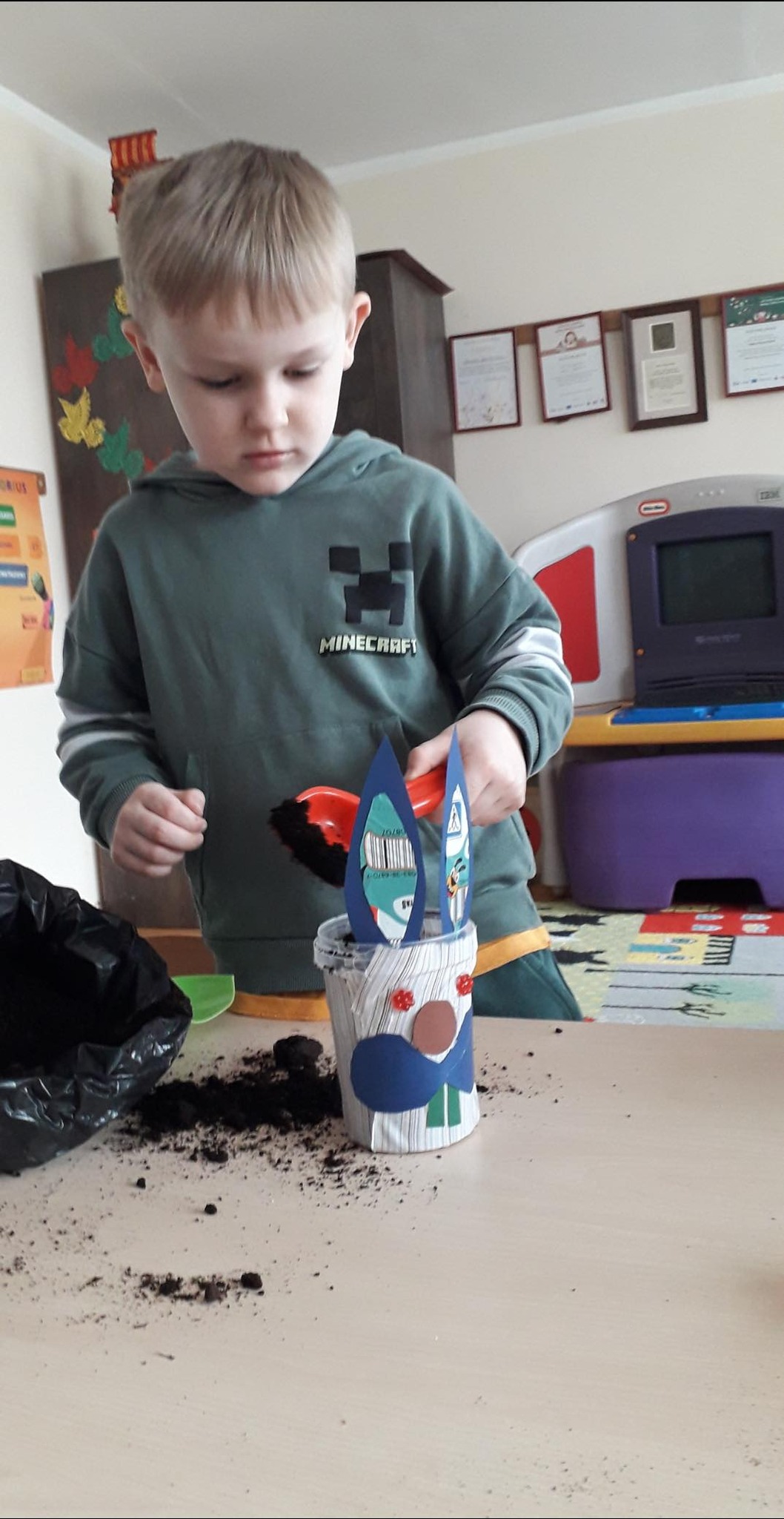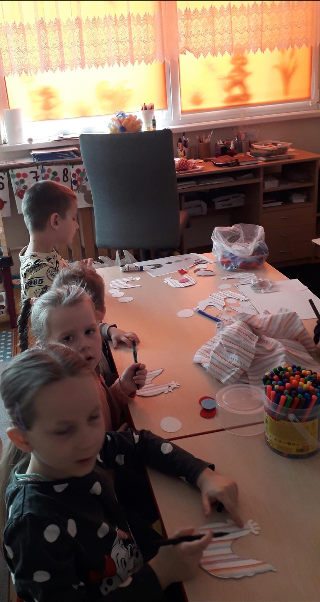 Laukdami šv. Velykų, mūsų mažųjų kūrėjų rankos senus daiktus pavertė kūryba ir prikėlė naujam gyvenimui. Darželinukai (mokytoja Regina Miknevičienė) dalyvavo „Žaliojo raštingumo” dirbtuvėse ir iš antrinių žaliavų gamino spalvingas, originalas Velykų dekoracijas: vištaites su kiaušiniais ir zuikučius, kurių pasėti „plaukučiai” dar turi sudygti ir užaugti. Darbeliams buvo naudojami įvairūs karoliukai, tekstiles atraižos, dėžių kartonas, skardinės nuo kavos, sagos, kombinuotos pakuotės. Vaikai lavino savo vaizduotę, kūrybiškumą bei ugdė atsakingą požiūrį į mūsų planetos saugojimą.