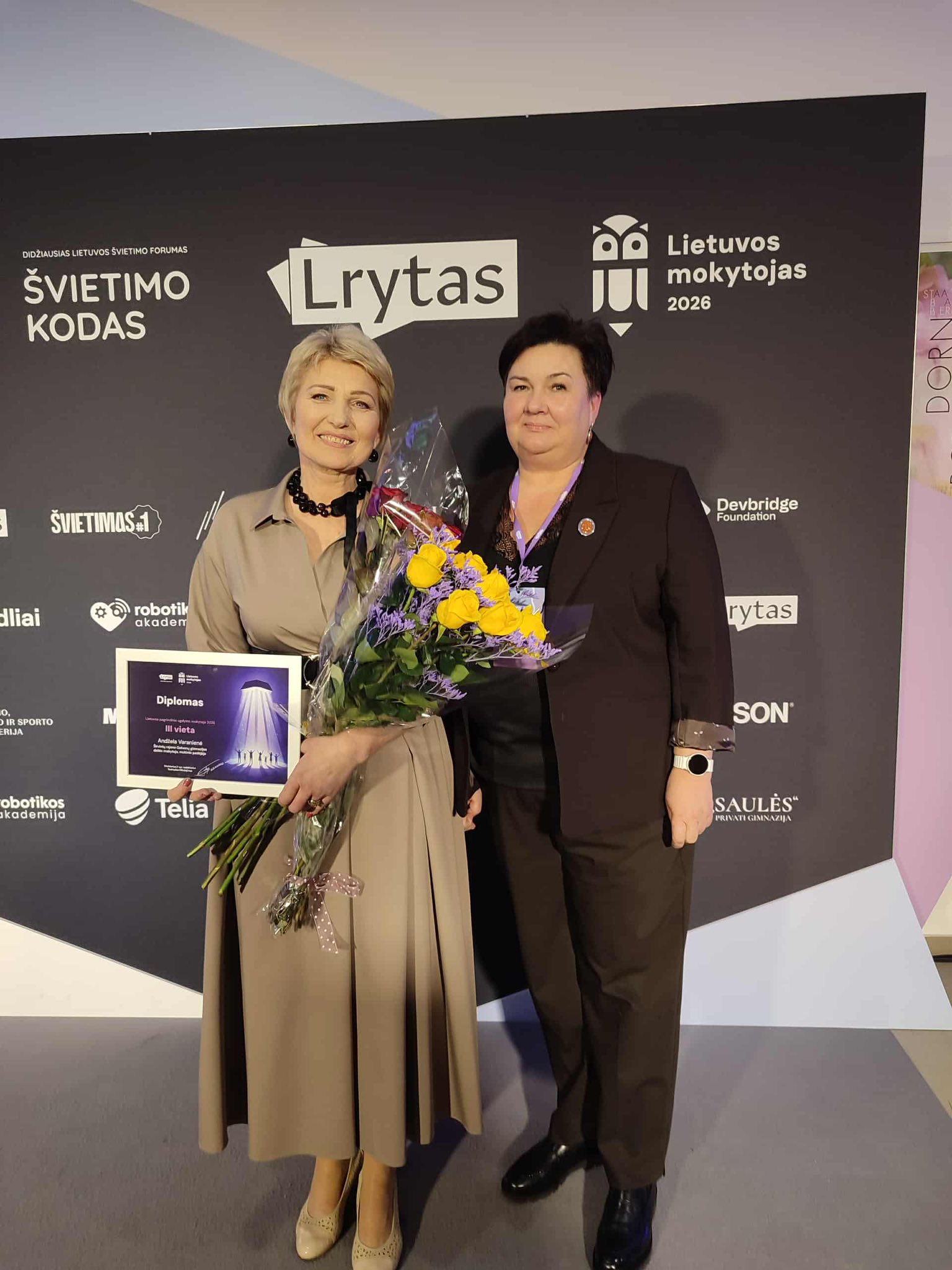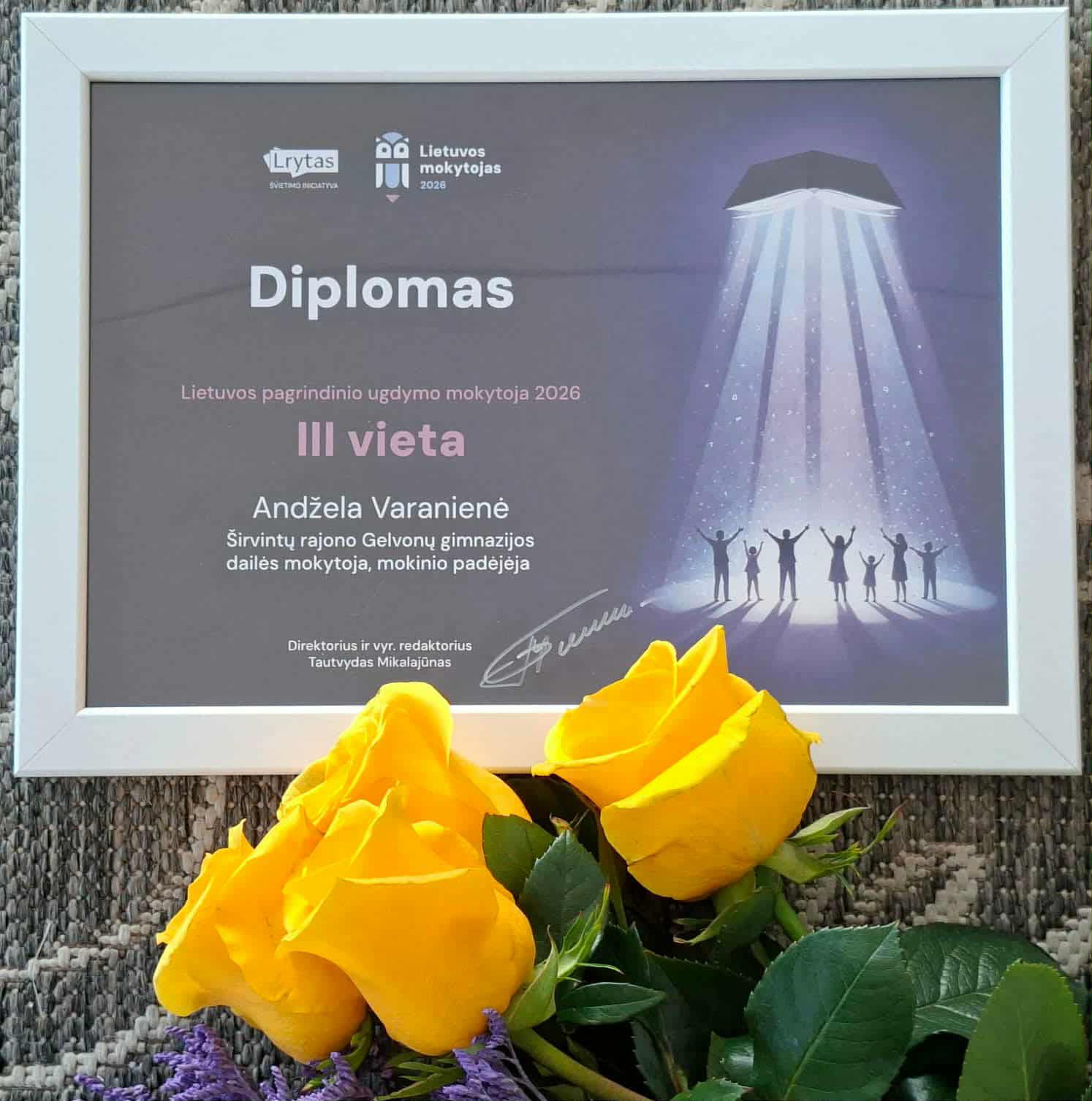 Švietimo forumas „Švietimo kodas 2026“ į Kauno VDU didžiąją salę sukvietė 3000 vadovų, mokytojų, politikų, dėstytojų, verslo atstovų ir švietimui neabejingų žmonių. Forumo dalyvius pasveikino švietimo ministrė Raminta Popovienė, buvo diskusijų, aštrių klausimų, protingų atsakymų, pasižadėjimų, karštų pasisakymų. Nuspręsta, jog švietimo klausimai yra aktualūs visoms bendruomenėms. Renginį vainikavo „Lietuvos mokytojas 2026“ rinkimų finalas. Naujienų portalas „Lrytas“ šeštus metus iš eilės kvietė balsuoti už mokytojus „Lietuvos mokytojas“ rinkimuose, taip parodant jiems dėmesį, padėkojant už svarbų darbą. Labai didžiuojamės ir džiaugiamės, kad Širvintų r. Gelvonų gimnaziją atstovavo mokytoja Andžela Varanienė. Nominacijoje „Pagrindinio ugdymo mokytoja“ ji pelnė III vietą. Tai didelio darbo, meilės mokiniams, sutarimo su tėvais ir bendruomene rezultatas. Žemaitija mums padovanojo grynuolį gintarą, kuris žiba Gelvonų gimnazijoje. Mokytojo kelias nėra švelnus, ypatingai jei kopiame į kalną, tačiau pasiekus viršūnę visada pamatome Saulę.