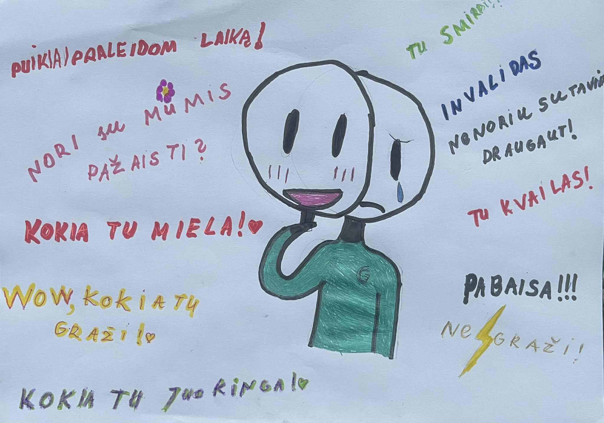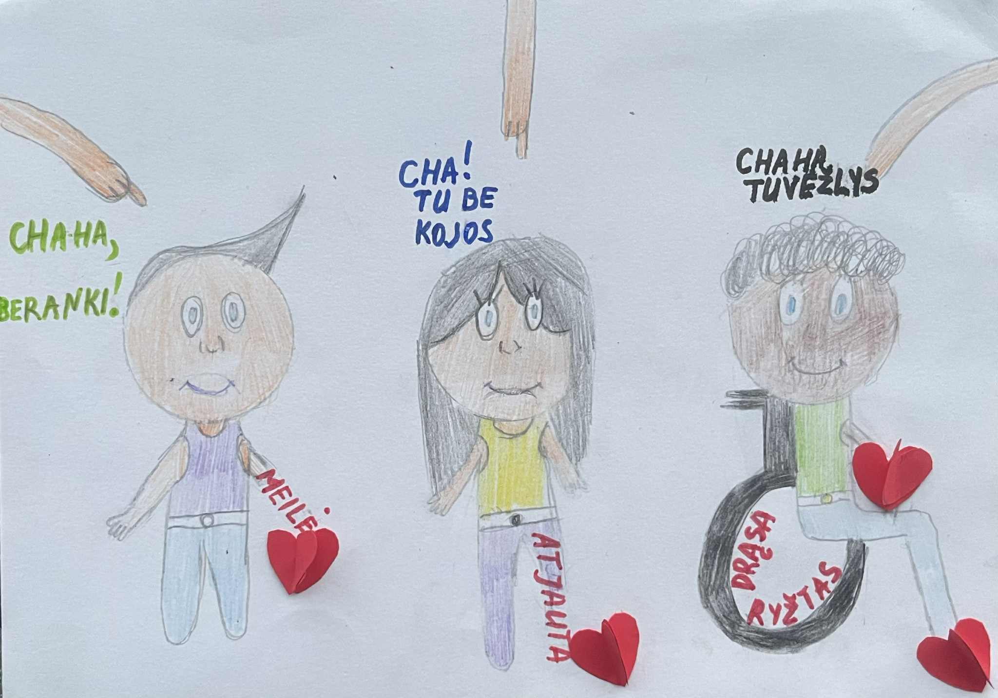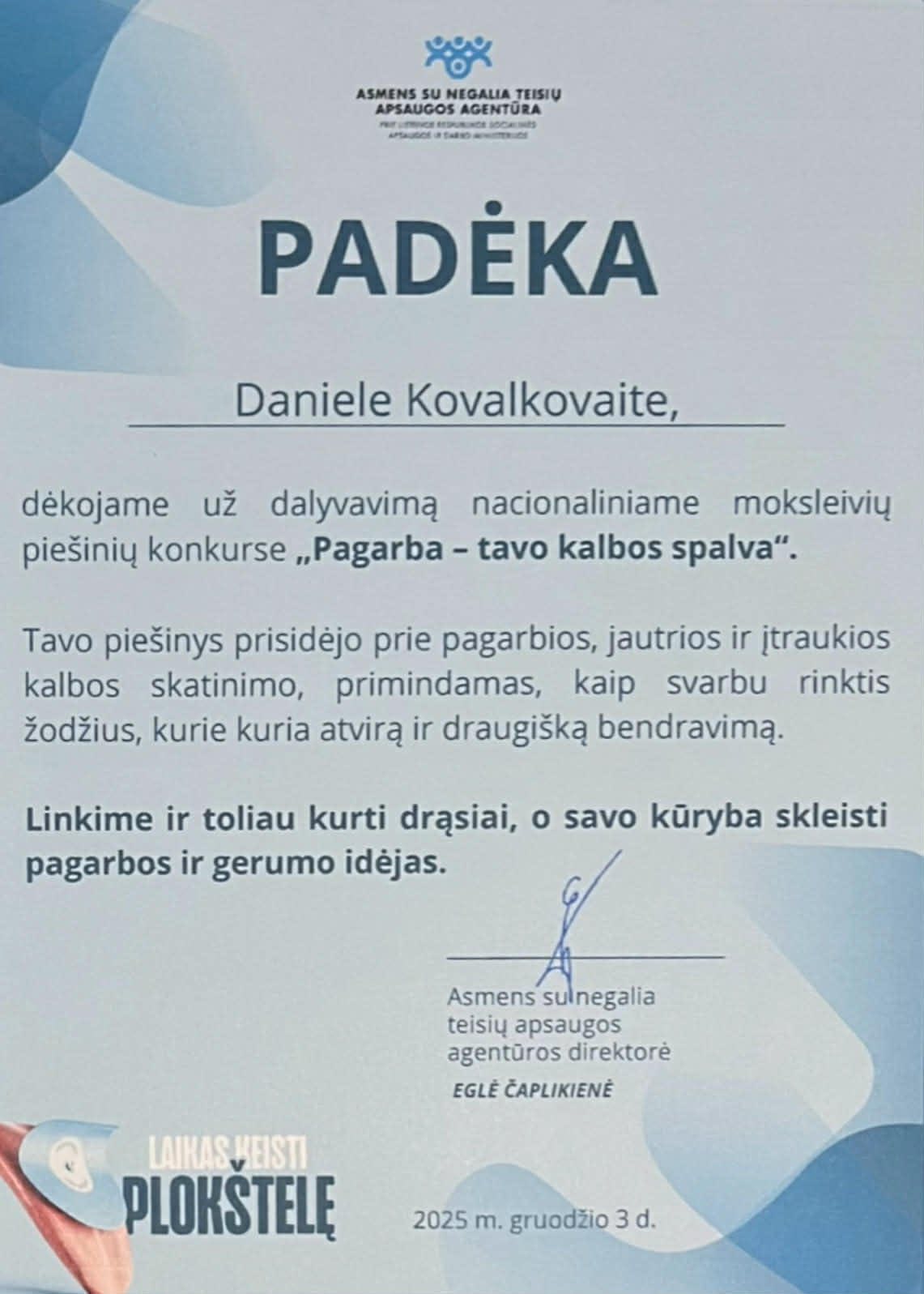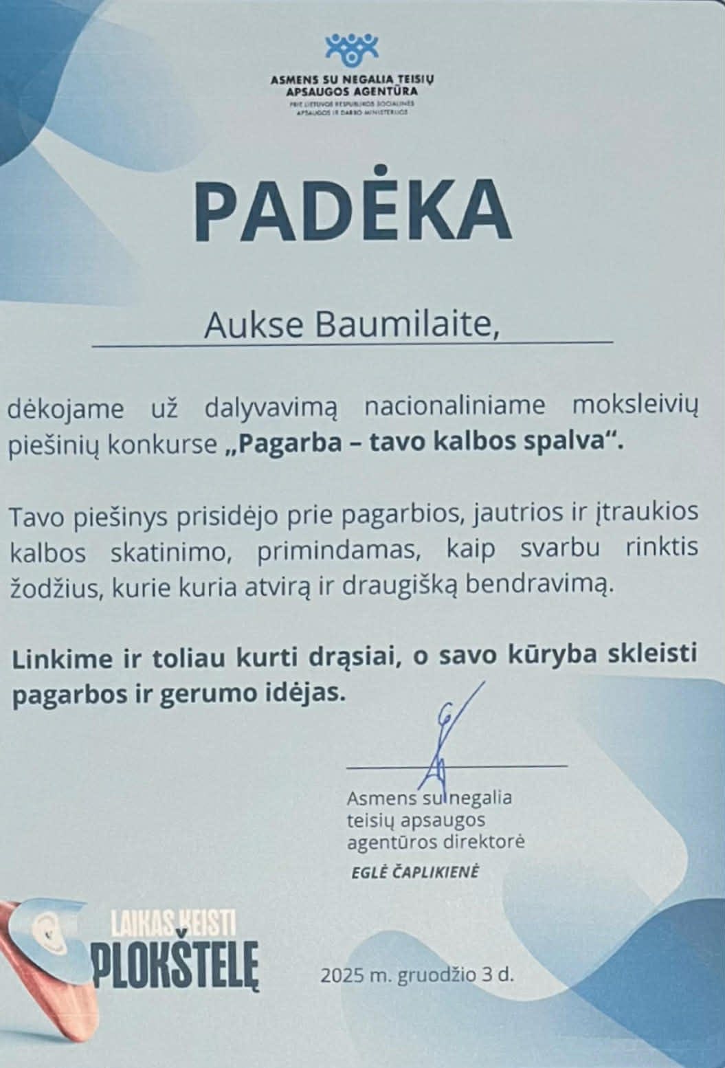 Nacionaliniame mokinių piešinių konkurse „Pagarba – tavo kalbos spalva“, inicijuotame Asmens su negalia teisių apsaugos agentūros, dalyvavo net 494 moksleivių darbai iš įvairių Lietuvos kampelių. Įvairaus amžiaus moksleiviai per piešinius atskleidė, ką jiems reiškia negaliai jautri kalba, pagarba ir žmogiškumas. Piešiniai jautriai atskleidė, kaip kalba gali žeisti arba įkvėpti, formuoti požiūrį į kitą žmogų ir prisidėti prie pagarbios, atviros bei įtraukios visuomenės kūrimo. Konkursinių darbų vertinime dalyvavo dailės, švietimo, žmogaus teisių ir negalios tematikos ekspertai, Lietuvos Respublikos Prezidento kanceliarijos bei Asmens su negalia teisių apsaugos agentūros atstovai. Tarp konkurso dalyvių – ir mūsų gimnazijos penktokės Kamilė Jakubaitytė, Auksė Baumilaitė bei Danielė Kovalkovaitė (mokytoja Andžela Varanienė). Nuoširdžiai dėkojame mokinėms už aktyvų dalyvavimą ir prisidėjimą prie iniciatyvos, skatinančios pagarbą, empatiją bei atsakingą kalbos vartojimą.