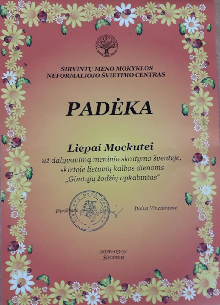 Kovo 31 d. mūsų gimnazijos priešmokyklinukė Liepa Mockutė (mokytoja Regina Miknevičienė) dalyvavo meninio skaitymo šventėje, skirtoje lietuvių kalbos dienoms „Gimtųjų žodžių apkabintas”. Mergaitė deklamavo Juozo Nekrošiaus eilėraštį „Boružių švarkeliai”. Liepos debiutas prieš didelę auditoriją pavyko puikiai. Džiaugiamės ir didžiuojamės.